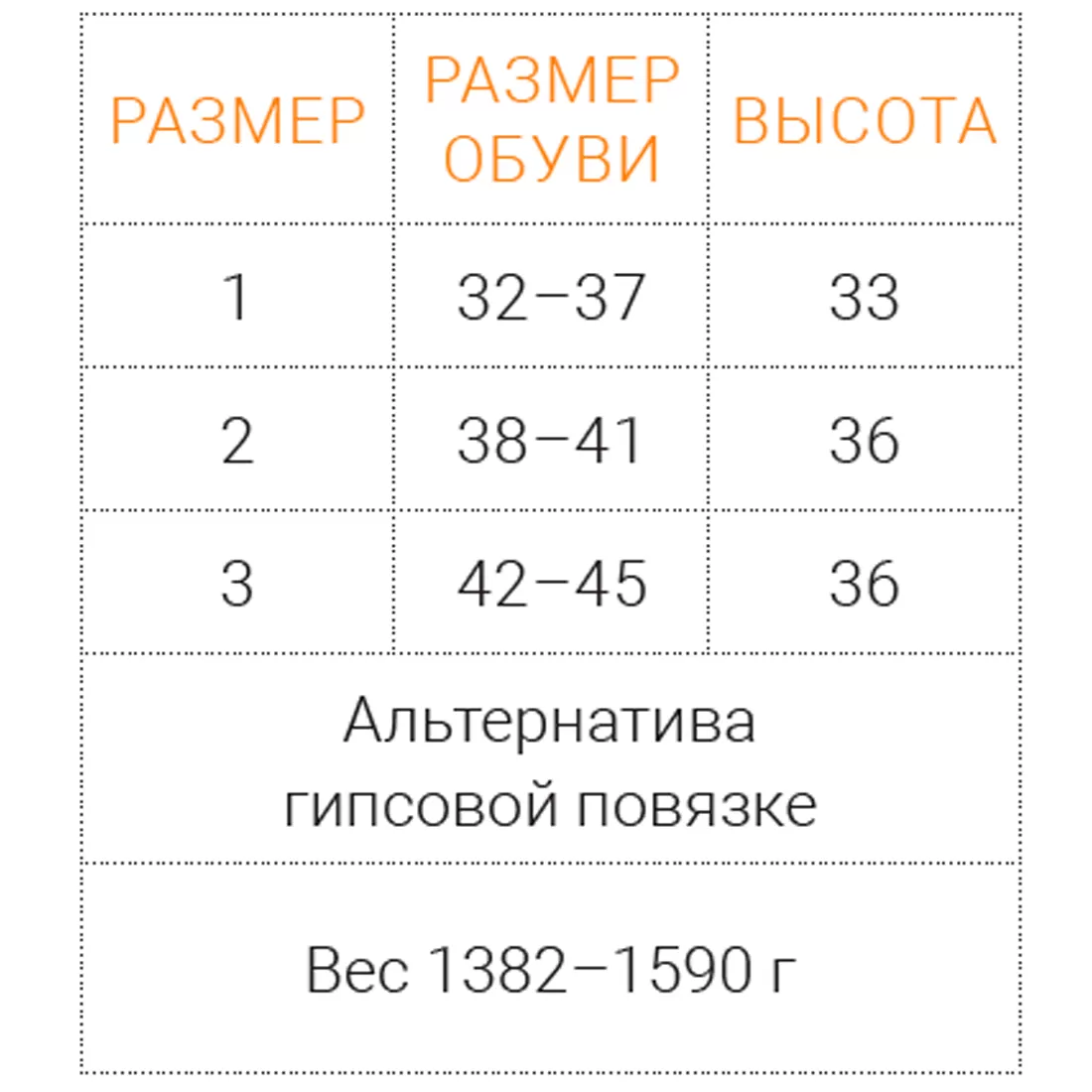 • Высота ортеза от 36,5 до 40,5 см и вес от 1 390 до 1 530 грамм - в зависимости от выбранного размера.