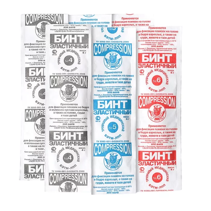 - №4 – для фиксации повязок на кисти, предплечье, стопе, плече, голени, лучезапястном, голеностопном, коленном и локтевом суставе взрослых, а также на голове, бедре, голени и коленном суставе детей.
