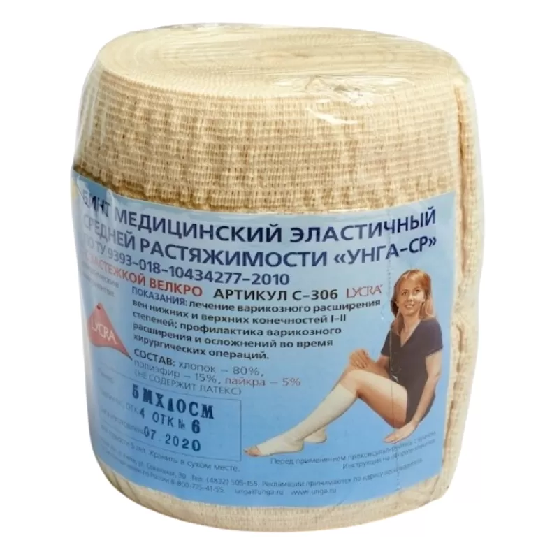 Бинт медицинский эластичный УНГА-СР (I-ый класс компрессии) предназначен для профилактики и лечения начальной стадии, I-ой, II-ой степеней варикозного расширения вен верхних и нижних конечностей.Бинты изготовлены на основе эластомера LYCRA ® и натурального хлопка (до 80%).
