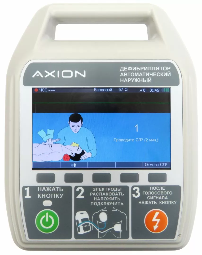 - Дефибриллятор автоматический ДА-Н-01 Аксион предназначен для лечебного воздействия на сердце одиночным бифазным импульсом посредством пары электродов, трансторакально, также для наблюдения электрокардиограммы пациента и выдачи инструкций оператору при выполнении сердечно-легочной реанимации