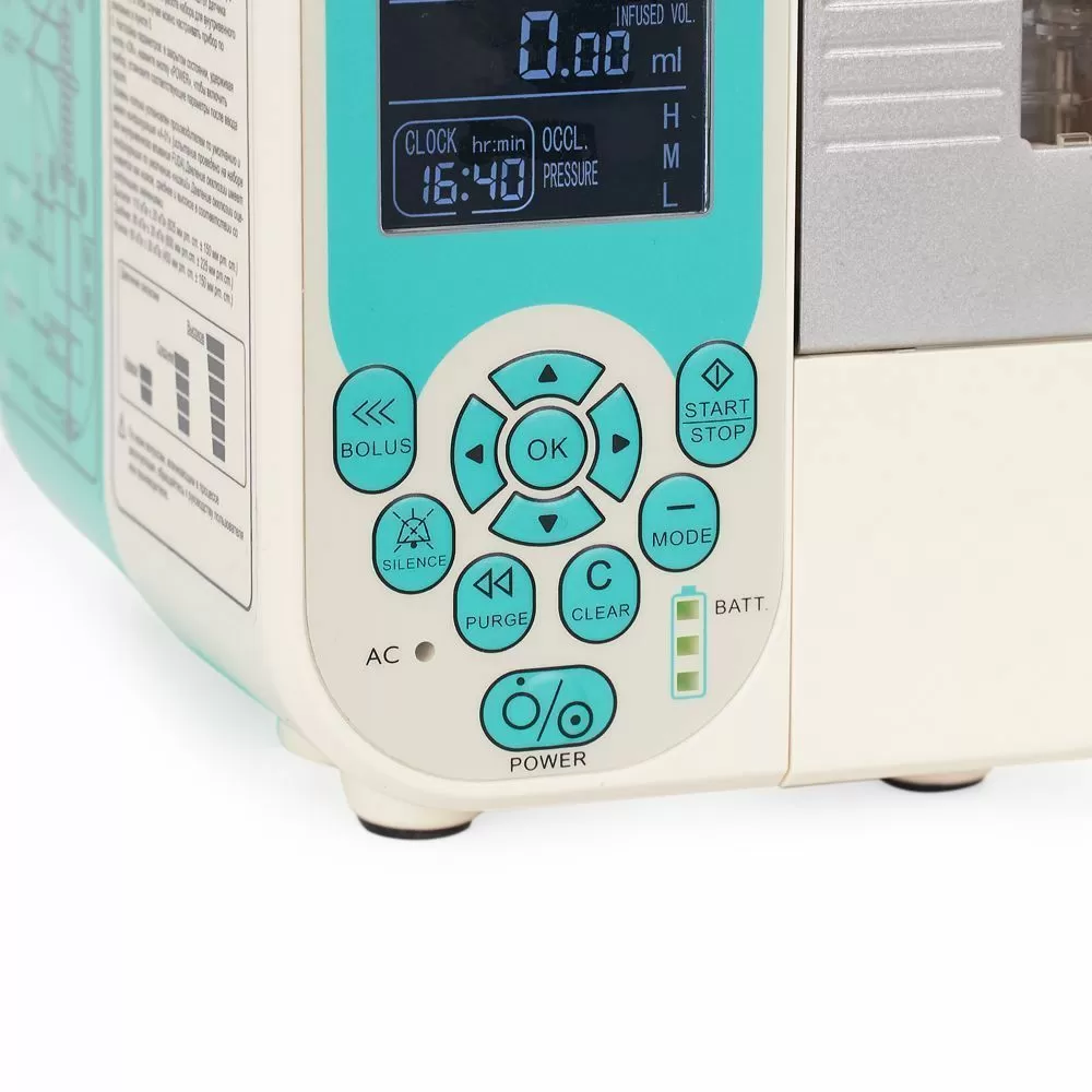- Панель управления состоит из кнопок с высоким уровнем чувствительности и понятным обозначением. Настраивать прибор получается очень быстро. Скорость и объем подачи лекарства настраиваются вручную или автоматически в зависимости от веса пациента и необходимого времени введения препарата.