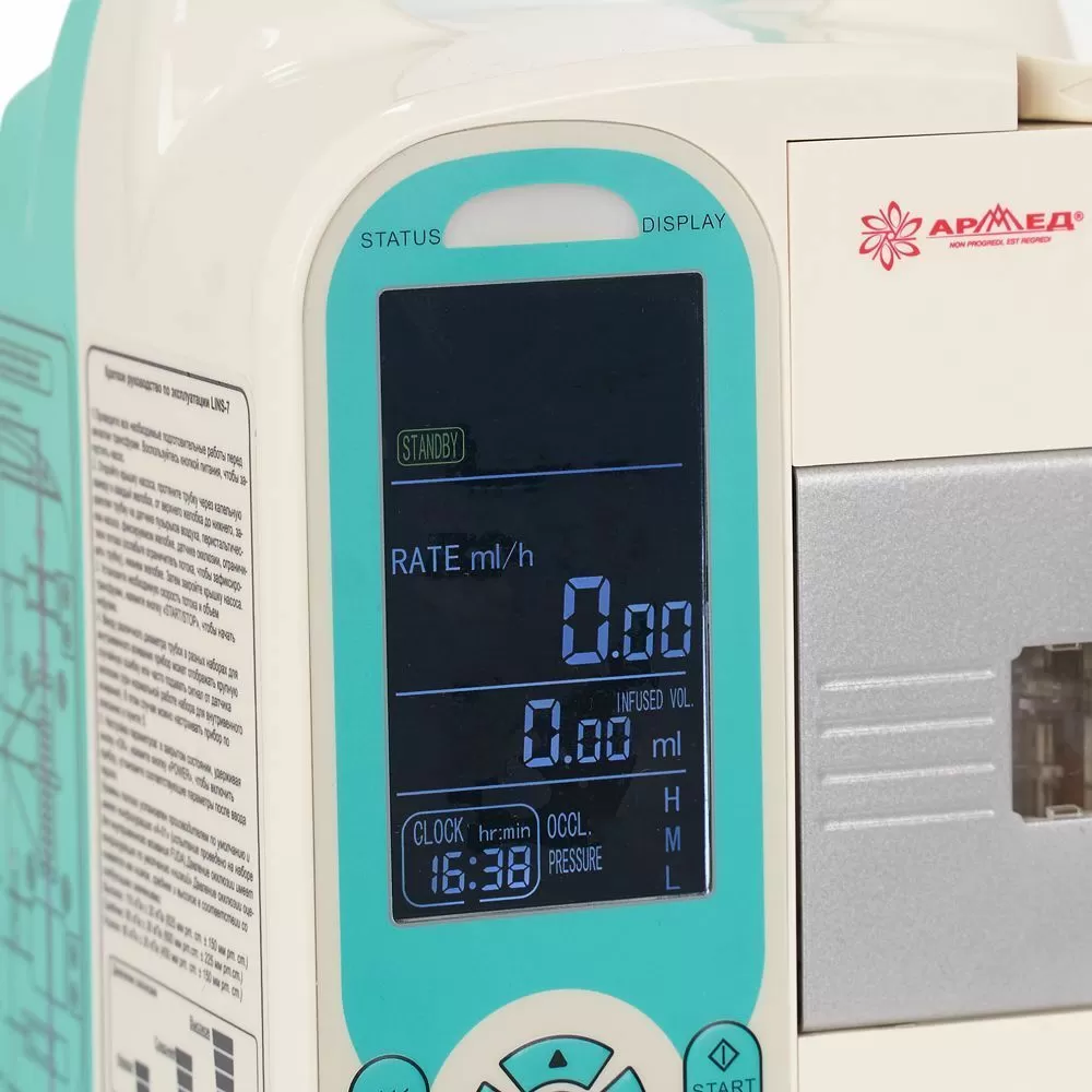 - На экране отображаются основные параметры настройки: скорость и объем вливания, время процедуры, заряд аккумулятора, подключение к электросети, системные ошибки и прочее. Показатели облегчают контроль за оборудованием.