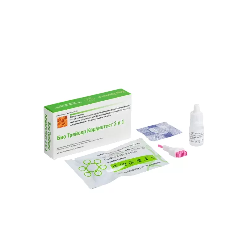 Набор реагентов «Тест-система иммунохроматографическая для качественного определения миоглобина, креатинкиназы MB и/или сердечного тропонина I в образцах сыворотки (плазмы) или цельной крови человека» «БиоТрейсер Кардиотест 3 в 1» предназначен для качественного одноэтапного быстрого выявления миоглобина, креатинкиназы MB и/или сердечного тропонина I в образцах сыворотки (плазмы) или цельной крови человека методом иммунохроматографического анализа (ИХА) с целью диагностики инфаркта миокарда.