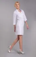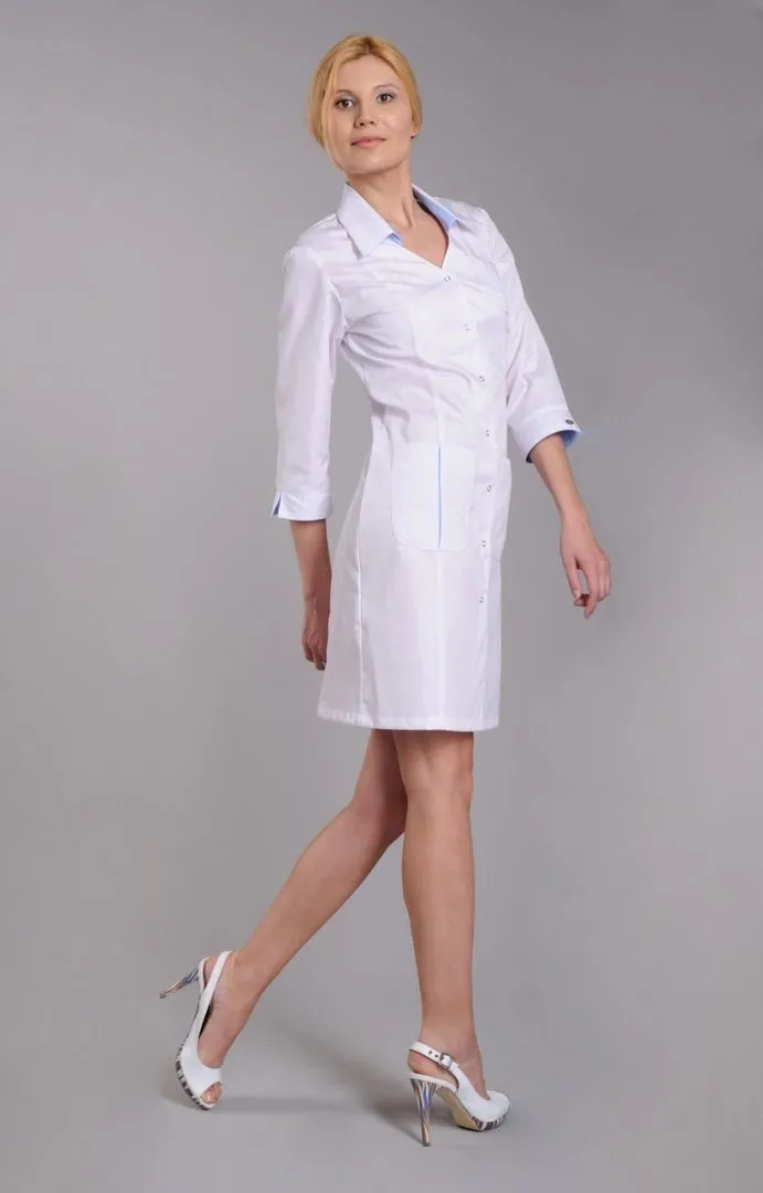 Этот медицинский халат прекрасно подойдет молодым женщинам. Небольшое количество контрастного цвета в складках карманов и стойках воротника становится слегка заметно при движении. Но основная цветовая гамма этого халата - белая.