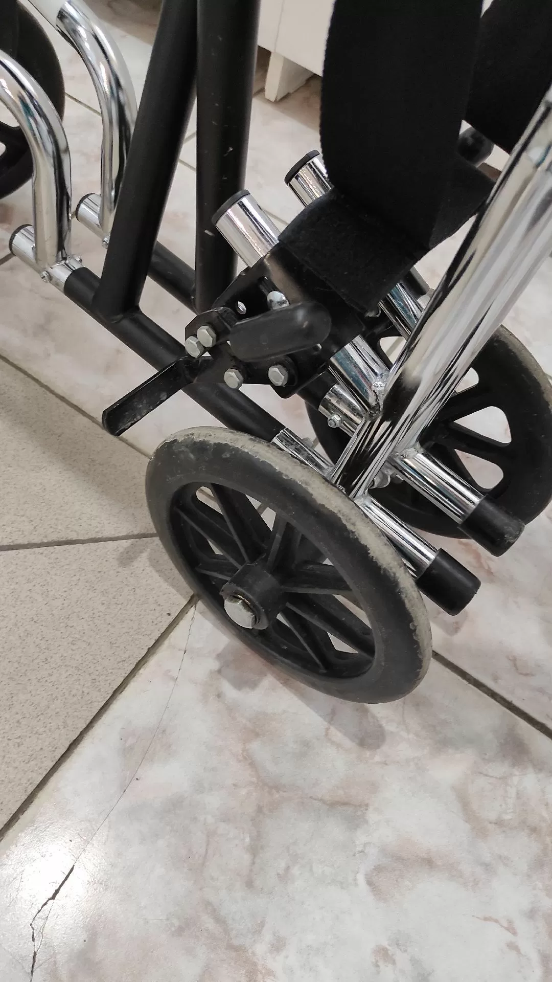 Цельнолитые колеса позволяют с комфортом перемещаться в помещении. Фиксируется положение с помощью стояночного тормоза. Для удобства пересаживания подножки поворачиваются и снимаются. Подлокотники фиксированные с мягкими накладками, и на них удобно опираться. Спинка складывается с помощью рычагов, что освобождает доступ к спине пациента. Рама тоже складная, поэтому каталку получится убрать очень быстро.