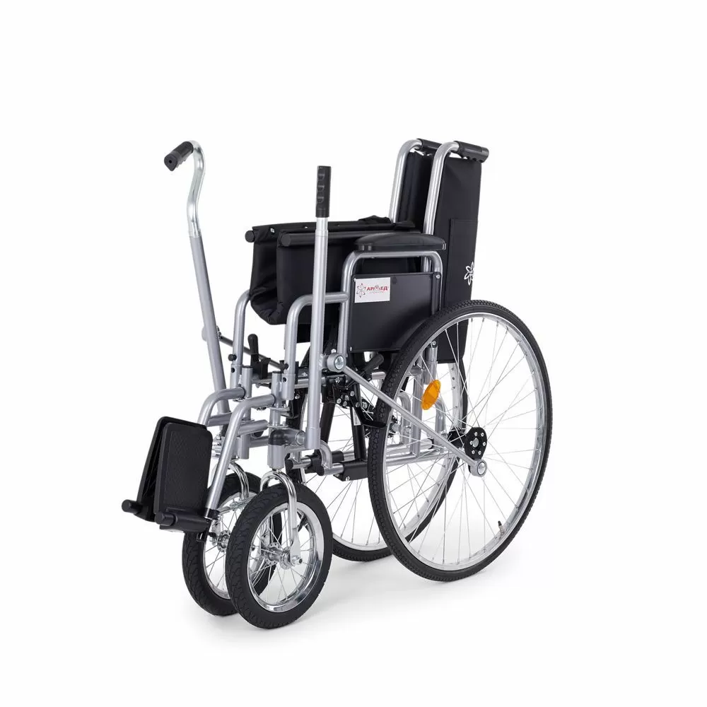 - Коляска оборудована рычажным управляющим механизмом – рулевого и тягового рычагов. С их помощью пациент сможет самостоятельно управлять коляской, меняя скорость передвижения и направление. Рулевой рычаг расположен под правую руку.