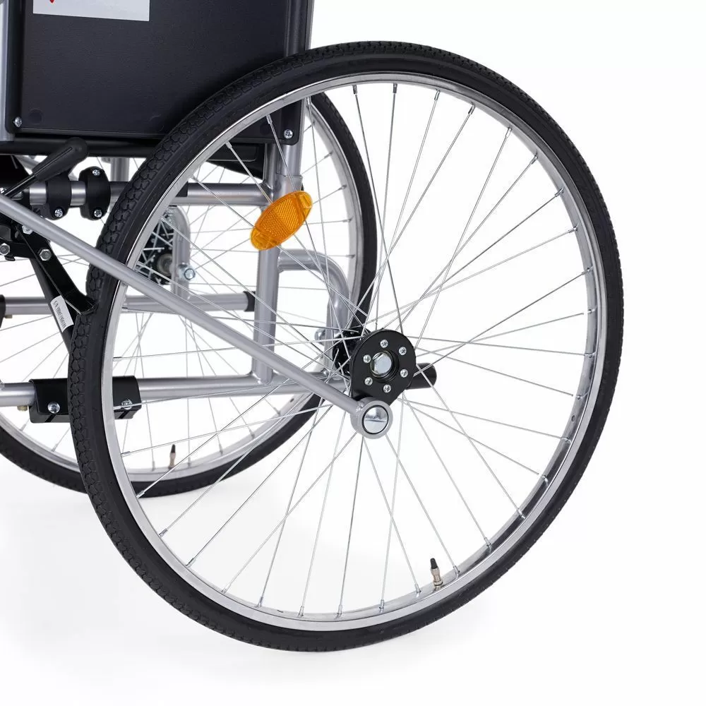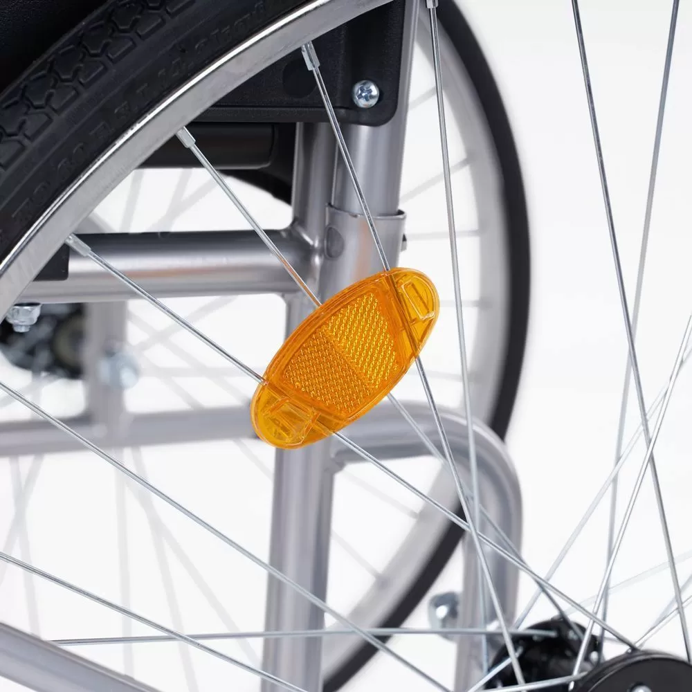 - Обе пары колес оснащены пневматическими шинами, поглощающими неровности дорожного покрытия. Передвижение по улицам будет максимально комфортным и безболезненным для пользователя. Задняя пара колес имеет стояночные тормоза по обе стороны для надежной фиксации во время остановки.