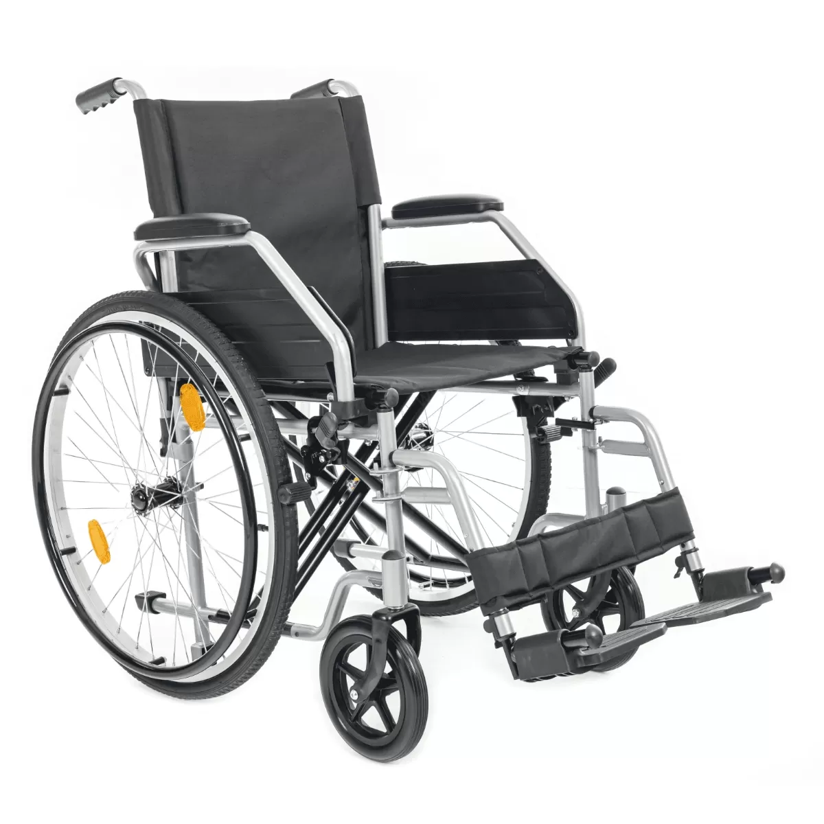 Съемные антиопрокидыватели делают езду в гору безопасной. Коляска снабжена откидными подножками и стояночным тормозом, что делает пересаживание человека из коляски и в неё более безопасным и удобным.