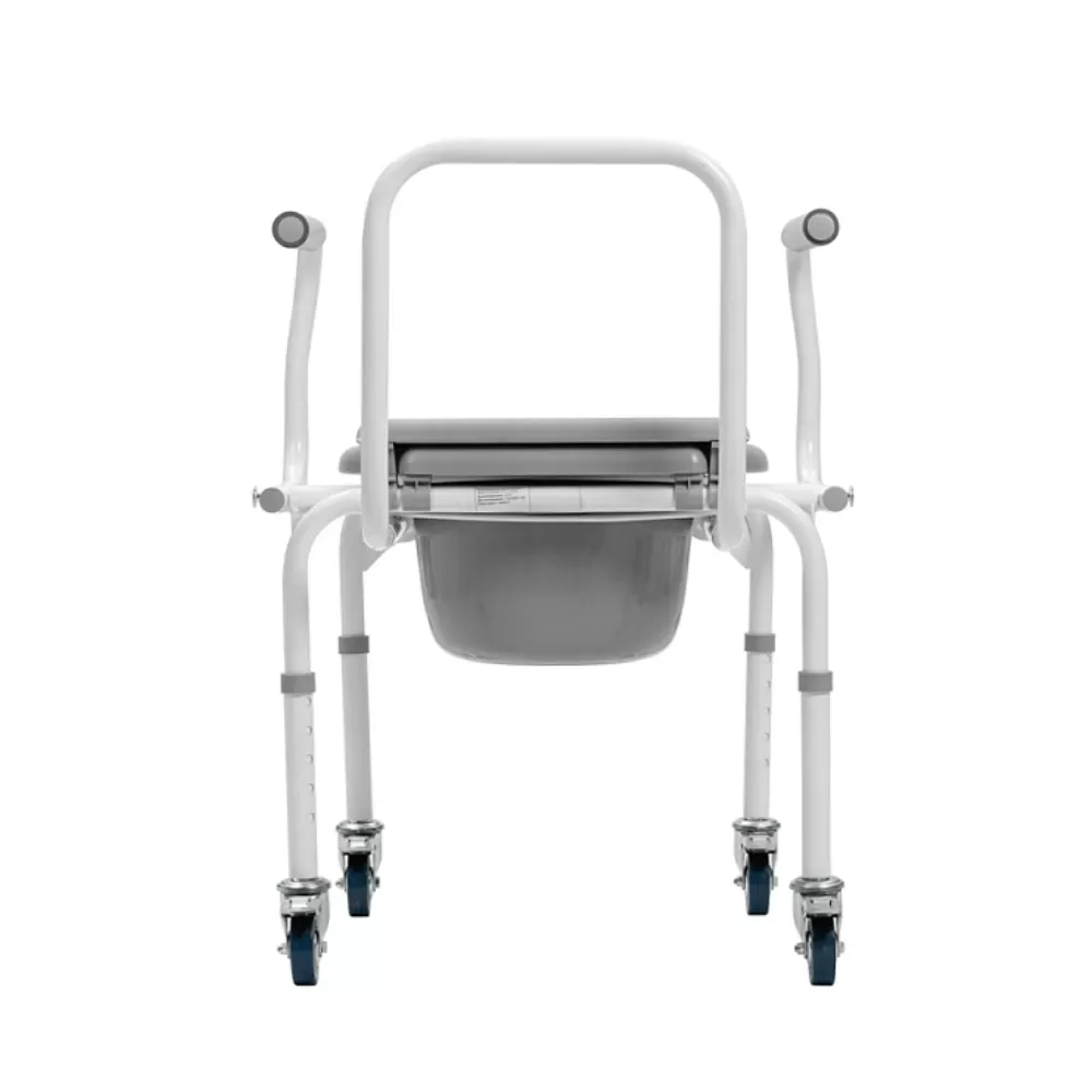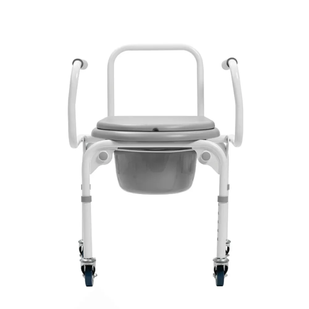 Откидные подлокотники с мягкими накладками и быстросъемная спинка делают удобным пересаживание на стул.