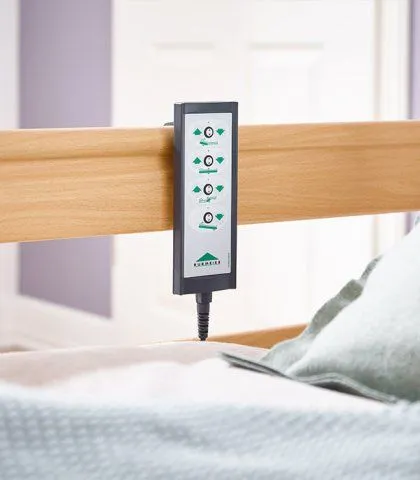 Положение секций изменяется с помощью проводного пульта. Использовать пульт может как пациент, так и ухаживающие за ним люди. Медицинский персонал имеет возможность заблокировать пульт, если на это есть причины, связанные с плохим клиническим состоянием пациента.Управление простое, так как отдельные кнопки определены соответствующими символами. Пульт управления может размещаться на кровати с помощью гибкого крючка. Спиральный кабель обеспечивает достаточную гибкость и свободу движений.