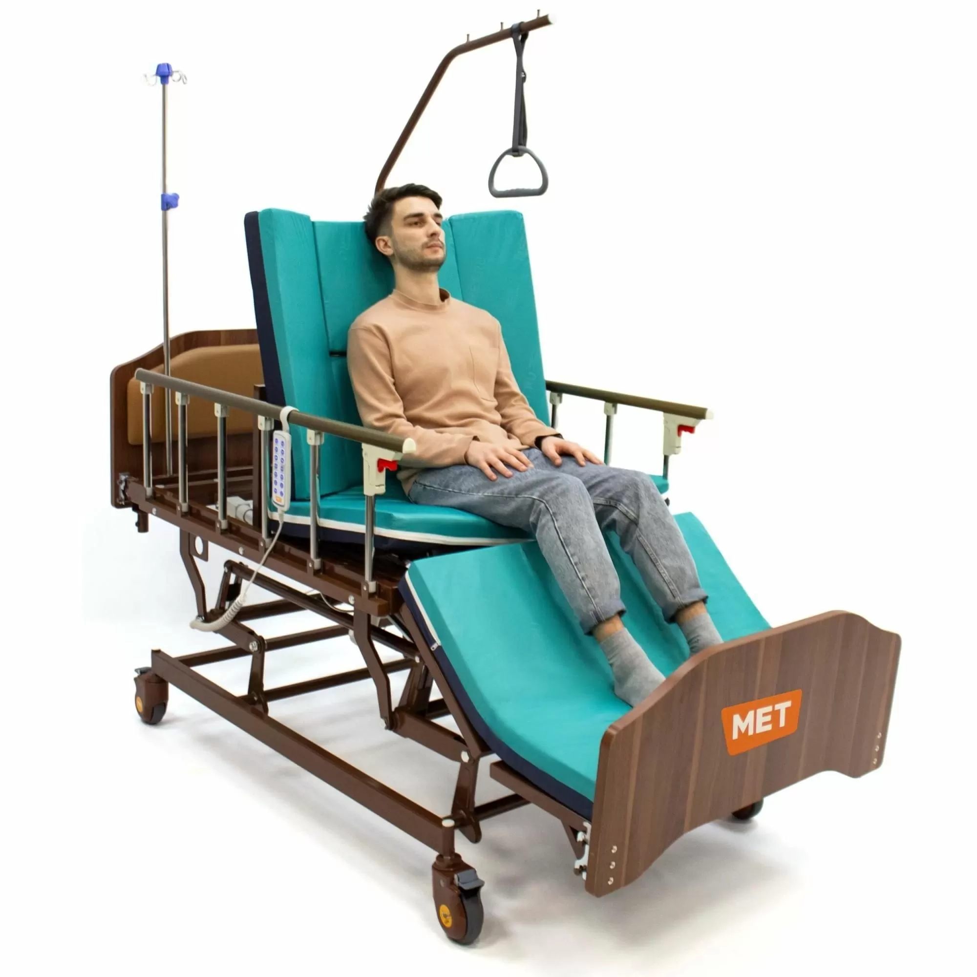Функциональная кровать с электроприводом, электрифицированной функцией переворачивания и туалетным устройством. Головная секция имеет "ушки", что позволяет больному отдыхать и спать в сидячем положении.Кровать оснащена быстросъёмными спинками. Сняв ножную спинку можно осуществить полноценный выход из кресла.
