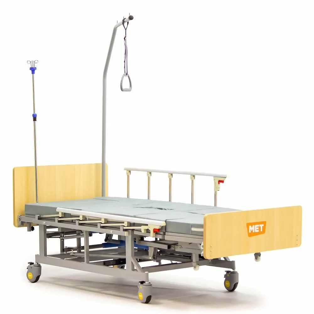 По краям кровати расположены специальные отверстия (4 штуки) для установки инфузионной стойки и других принадлежностей. В комплект входит инфузионная стойка, а также штанга для подтягивания больного с регулируемой по высоте рукояткой.