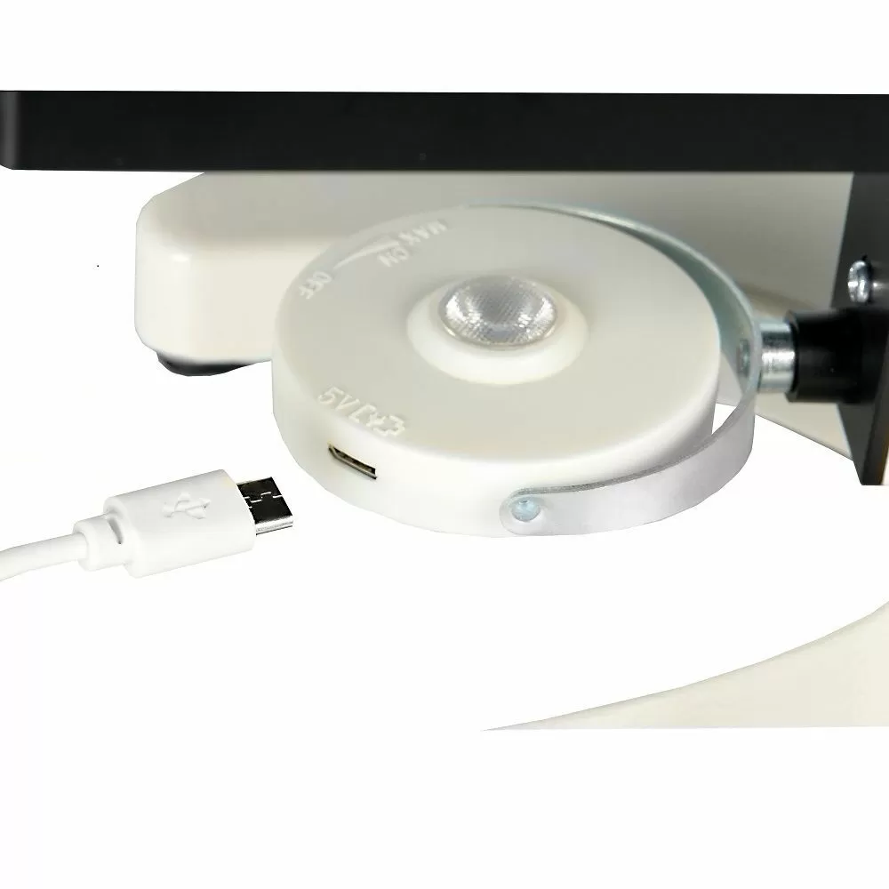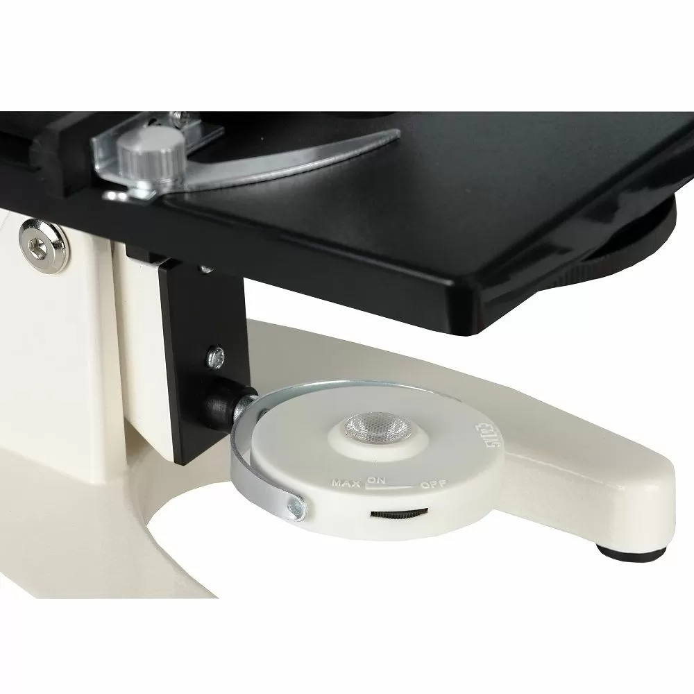 - Необходимый вид освещения можно выбрать исходя из условий наблюдений, для этого просто нужно повернуть осветитель. При наклоне штатива с окулярным тубусом на комфортный для наблюдений угол, также наклоняется и осветитель микроскопа, поэтому никаких дополнительных настроек не требуется.