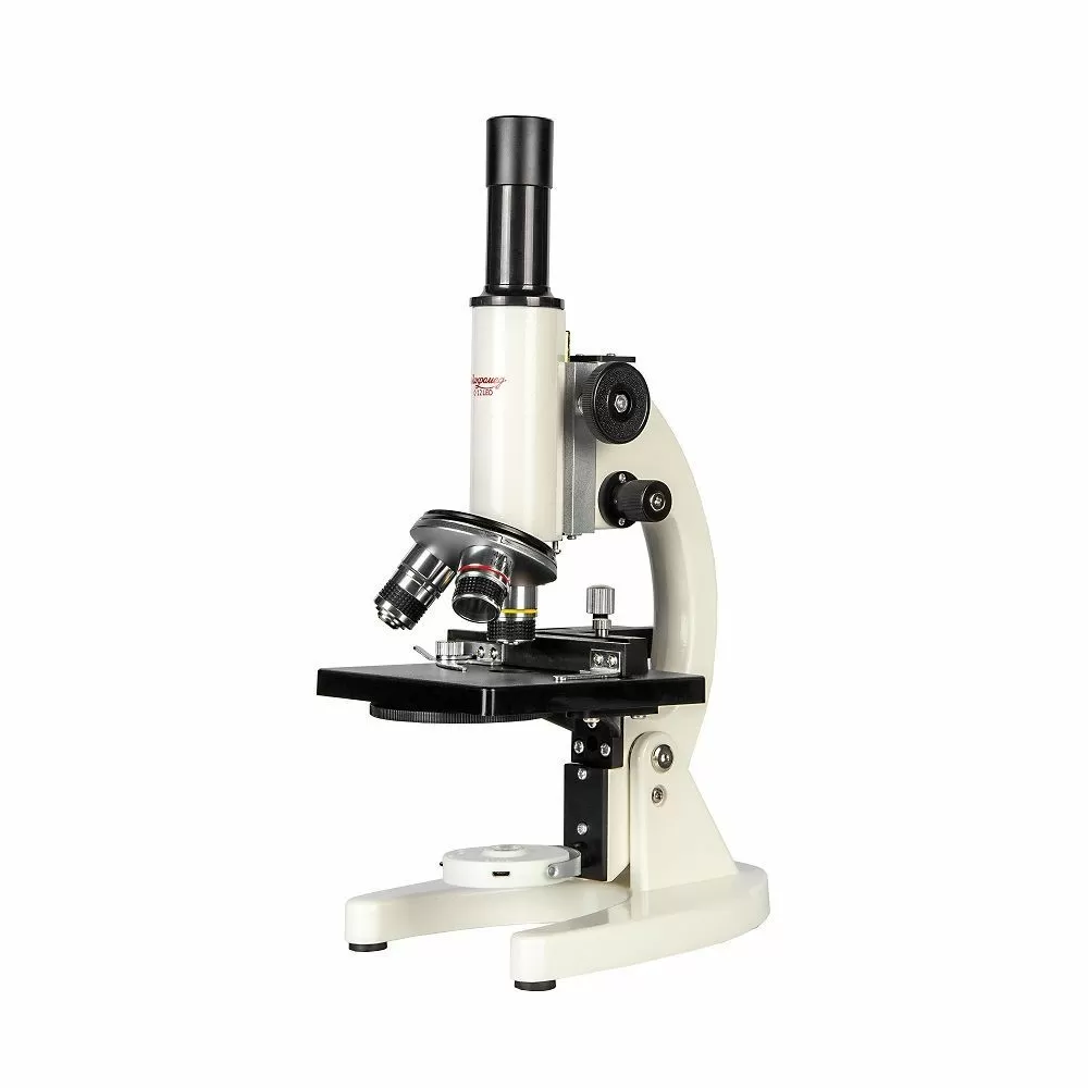 - Фокусировка микроскопа осуществляется перемещением по вертикали оптической головки вместе с объективами, окуляром и осветителем. Предметный столик при этом неподвижен. Механизм фокусировки имеет двухступенчатую конструкцию и обеспечивает как грубую, так и тонкую, прецизионную фокусировку. Наличие такого механизма у учебных микроскопов бюджетного класса большая редкость - как правило такими механизмами оснащаются профессиональные исследовательские микроскопы. Механизм снабжен рукоятками, выведенными на обе стороны штатива, и имеет ограничитель перемещения, что препятствует повреждению исследуемого образца и объектива.