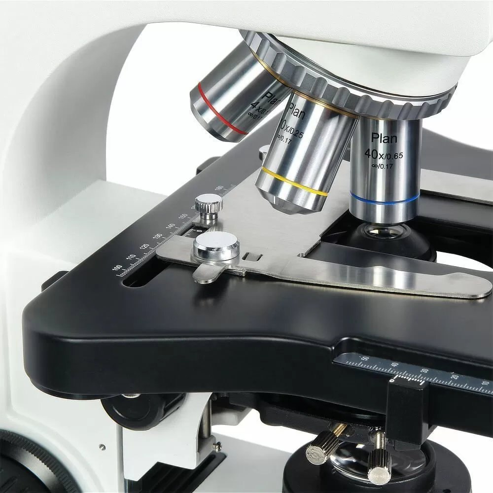 - В комплекте микроскопа - объективы с планахроматической коррекцией Plan 4x/0.13, Plan 10x/0.25, Plan 40x/0.65 и Plan 100x/1.25 oil. По дополнительному заказу микроскоп может быть укомплектован объективами Plan 20х/0.45, Plan 60х/0.80, флюоритовыми объективами Plan Fluor, объективами для работы в поляризованном свете SP POL и объективами фазового контраста Plan PH. Антигрибковое покрытие оптических поверхностей объективов позволяет без ограничений использовать микроскоп в биологических лабораториях.