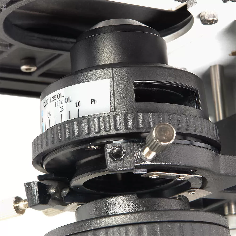 - Иммерсионный конденсор Аббе имеет числовую апертуру N.А.=1.25 при работе с масляной иммерсией и N.А.= 0.90 при сухих использованиях. Конденсор имеет центрируемую конструкцию и регулируемую апертурную ирисовую диафрагму. Для настройки освещения предусмотрена подвижка по оптической оси на 21,5 мм. В оправе конденсора имеется слот для установки дополнительного устройства – слайдера темного поля.