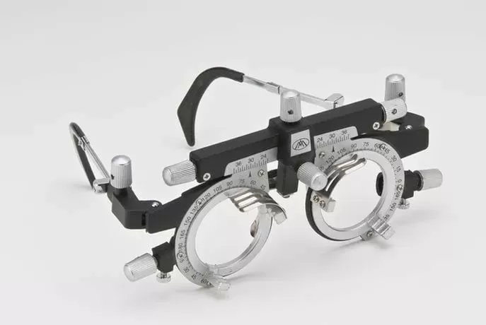 - В комплекте есть специальная универсальная пробная оправа со множеством различных регулировок. Это позволяет проводить обследование зрения пациентам с различной формой головы. Универсальная оправа позволяет установить до 4-х линз одновременно для более детального обследования зрения.
