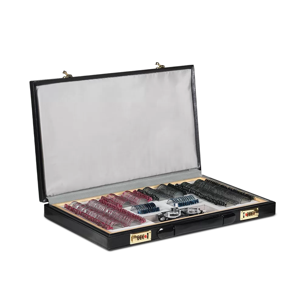 - В комплекте есть специальная универсальная пробная оправа со множеством различных регулировок. Это позволяет проводить обследование зрения пациентам с различной формой головы. Универсальная оправа позволяет установить до 4-х линз одновременно для более детального обследования зрения.