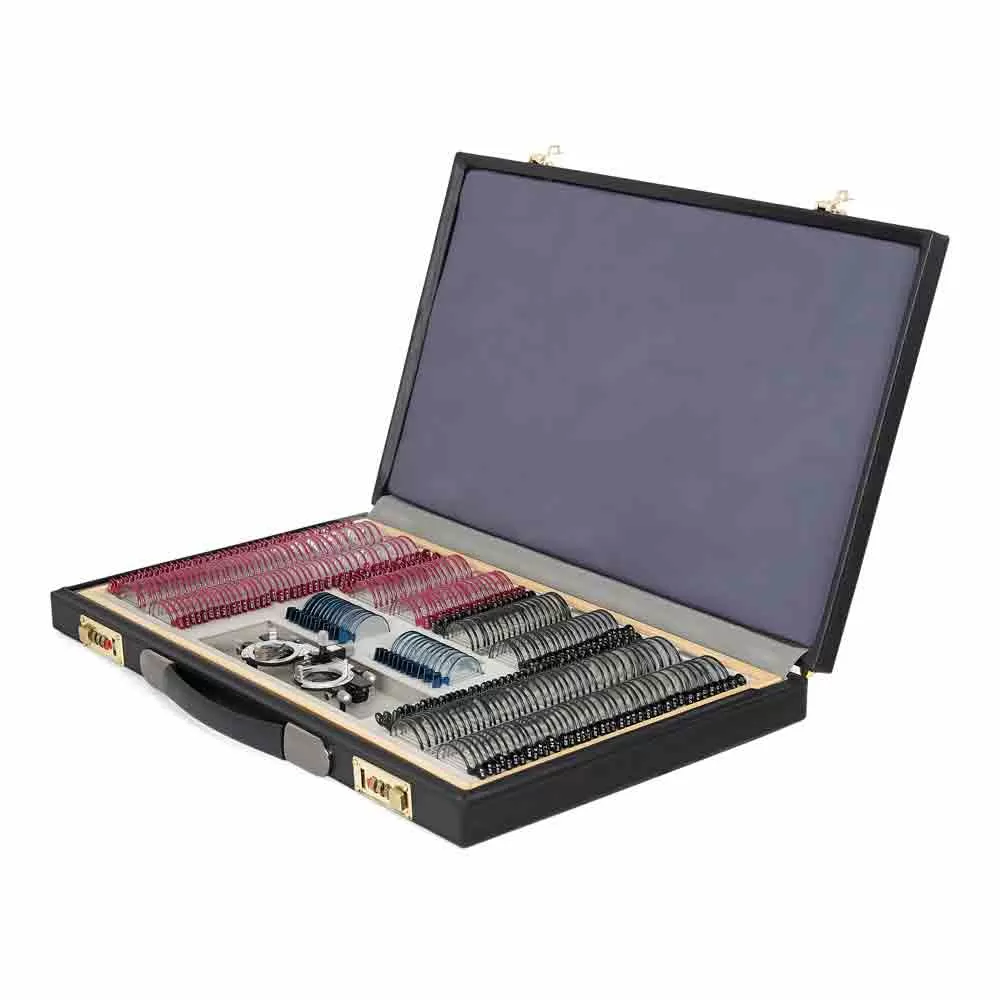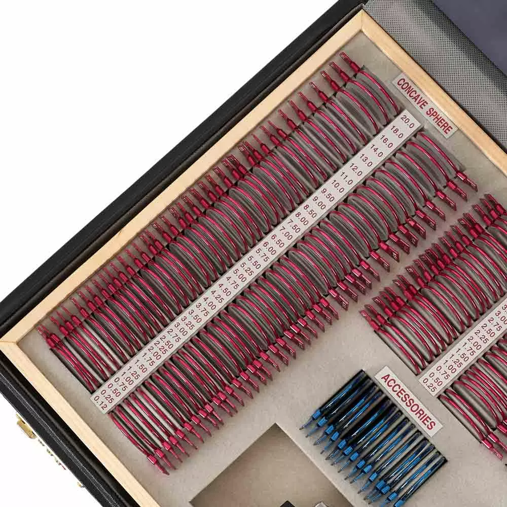 - Вспомогательные линзы, предназначенные для различных вспомогательных исследований зрения: точечная и щелевая диафрагмы, матовая пластина, полуматовая пластина, цилиндр Мэддокса, линза с перекрестием, красный и зеленый светофильтры, скрещенные цилиндры, плоскопараллельная пластина.