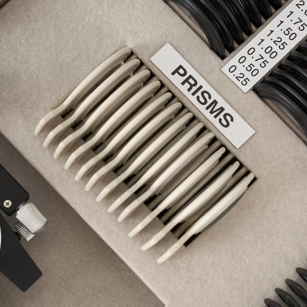 - Призматические линзы применяются при проверке косоглазия, скрытого косоглазия, а также для тренировки структур глаза. В набор входят линзы в диапазоне 0,5-10,0 диоптрий.