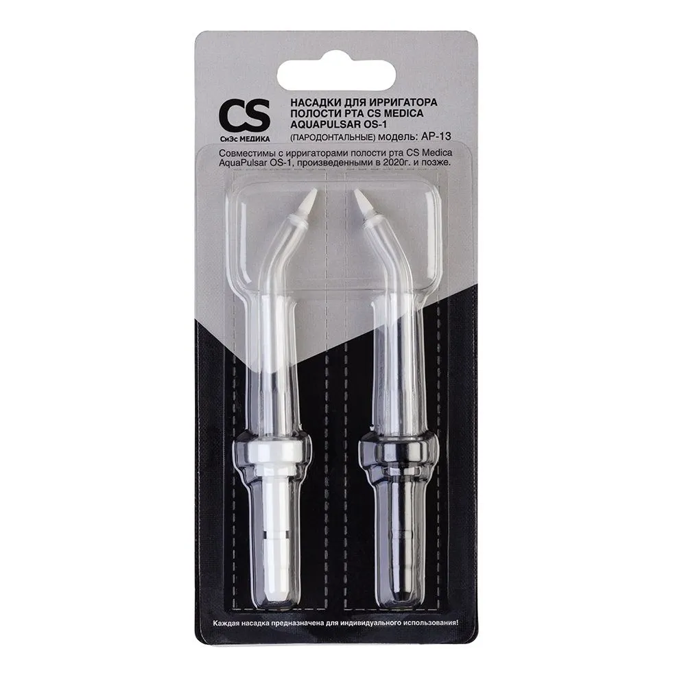 Насадки для ирригатора CS Medica Aquapulsar OS-1 AP-13 (пародонтальные) (2шт) - насадки с мягким наконечником, предназначены для деликатной гигиены пародонтальных карманов при воспаленных состояниях десен и повышенной их чувствительности.