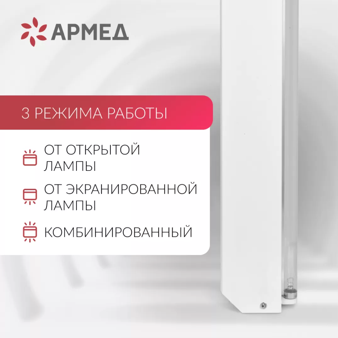 - Различные режимы. Облучатель имеет 3 режима работы: от открытой лампы (работает строго в отсутствие людей), от экранированной лампы и комбинированный.