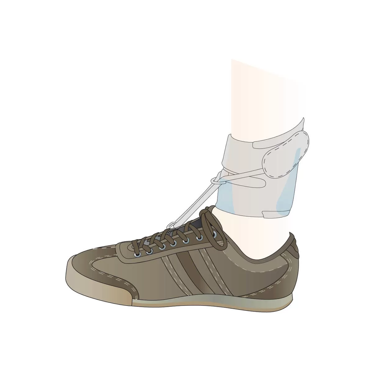 - Бандаж на лодыжку и часть, которая крепится к шнуровке обуви, соединены эластичным шнурком -> Поднимает средний и передний отделы стопы -> Ступня остается в среднем положении и не цепляется за землю во время фазы переноса конечности, что помогает избежать падения пациента.