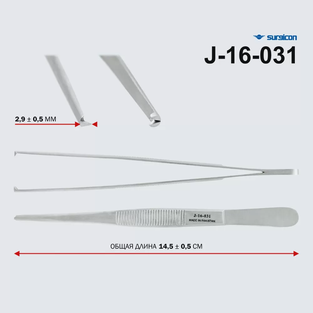 Пинцет хирургический для прочного удержания захваченной ткани, одна бранша которого имеет на конце два зубца, а вторая - один зубец, совмещающийся при смыкании пинцета с впадиной между зубцами первой бранши. Предназначен для расширения операционной раны, фиксации и оттягивания тканей.- Тип инструмента - зажимной
