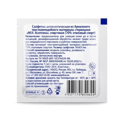 ООО «М.К. Асептика» - первая компания в России, которая начала производить салфетки антисептические спиртовые с 70% этиловым спиртом.Салфетка антисептическая стерильная спиртовая Асептика 56х65 мм. - медицинское изделие.