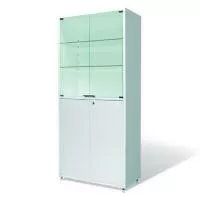 - В верхней части: двухстворчатая стеклянная дверца и две стеклянных полки