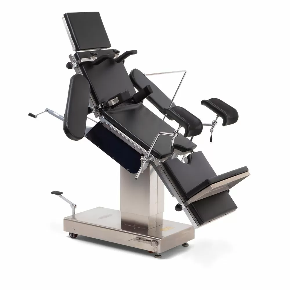 - Ложе стола можно наклонять вперед, назад и в стороны. Регулировка угла наклона секций, наклон Тренделенбург и АнтиТренделенбург осуществляются при помощи червячного механизма. Каждая секция стола смягчена специальной антистатической подушкой, обеспечивающей комфорт во время манипуляций. На спинной секции стола расположены съемные регулируемые опоры для плеч и рук. Голеностопная секция также оборудована съемной настраиваемой опорой.