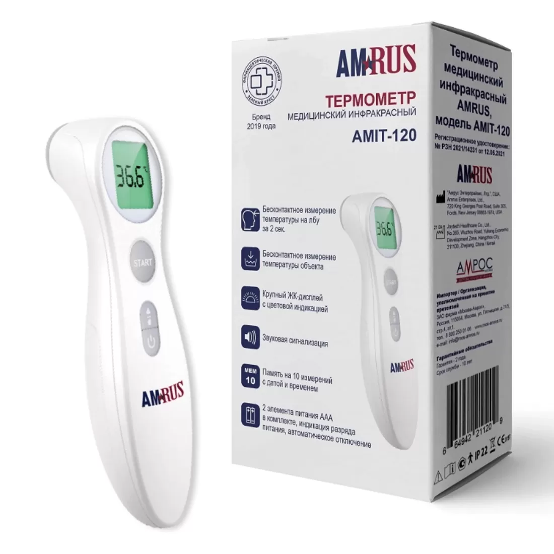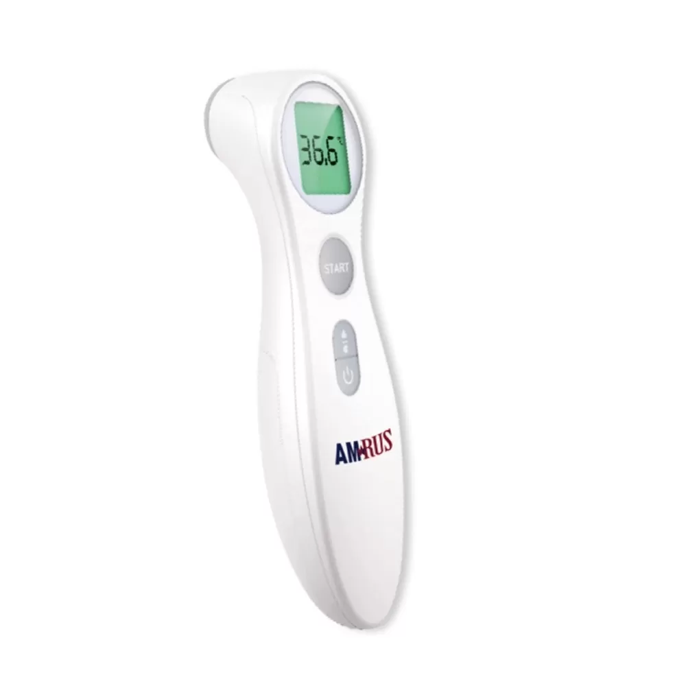 Инфракрасный медицинский термометр AMRUS AMIT-120 предназначен для измерения температуры тела человека (на лбу) и предметов бесконтактным способом. Время измерения – 2 сек. Прибор имеет крупный ЖК дисплей с цветовой индикацией, звуковую сигнализацию и память на 10 измерений с датой и временем. В комплект входят 2 элемента питания ААА. Термометр имеет индикацию разряда питания и автоматическое отключение.В режиме «Температура тела» прибор меняет цветовую индикацию в зависимости от температуры: