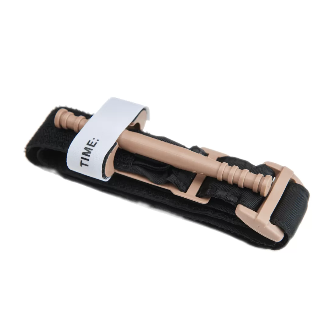 - Поместите самоклеящуюся ленту на ручку и внутрь фиксирующего механизма. Закрепите ручку и самоклеящуюся ленту с помощью ремня для фиксации ручки. Запишите время наложения жгута (для этого можно использовать шариковую ручку, которая в зависимости от варианта исполнения медицинского изделия дополнительно может входить в его состав, шариковая ручка размещается в торце ручки для затягивания жгута).
